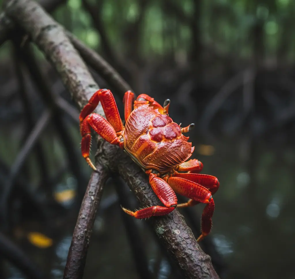 El sol se filtra a través del denso follaje, pintando el agua con destellos de luz. Es un santuario de paz donde la naturaleza habla. Estrellas de mar reposan en el fondo, ostras se aferran a las raíces como joyas y, si prestas atención, verás los vivaces cangrejos rojos moverse con sigilo entre el laberinto de madera y agua. Es una lección de ecología en vivo, un ecosistema vital que protege la costa y alberga una biodiversidad asombrosa.